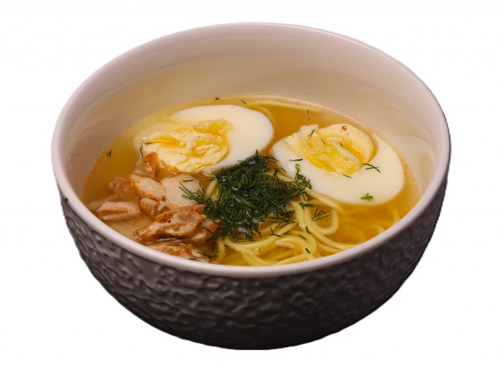 Куриный бульон, цыпленок, лапша удон, лук зеленый. Подается с яйцом и хрустящими сухариками