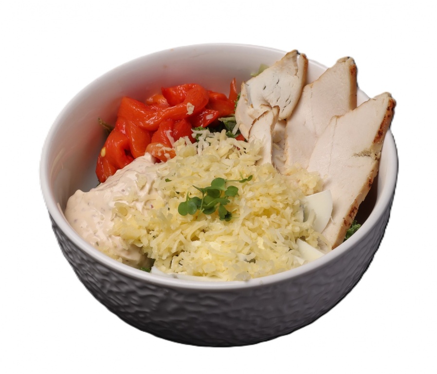 Куриное филе запеченное, микс салатов, перец болгарский, яйцо, сыр Гауда, соус Цезарь.