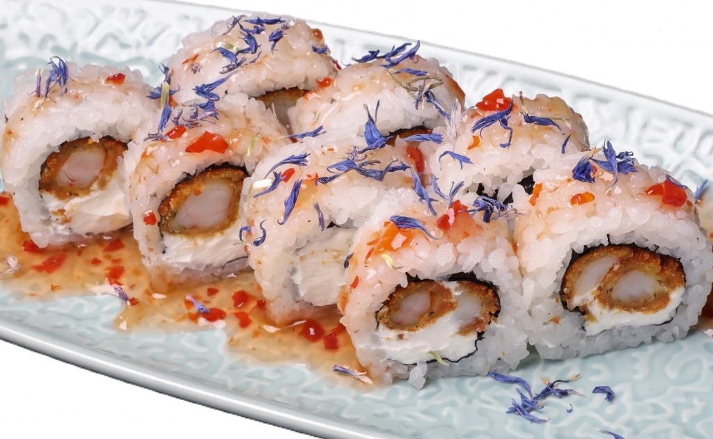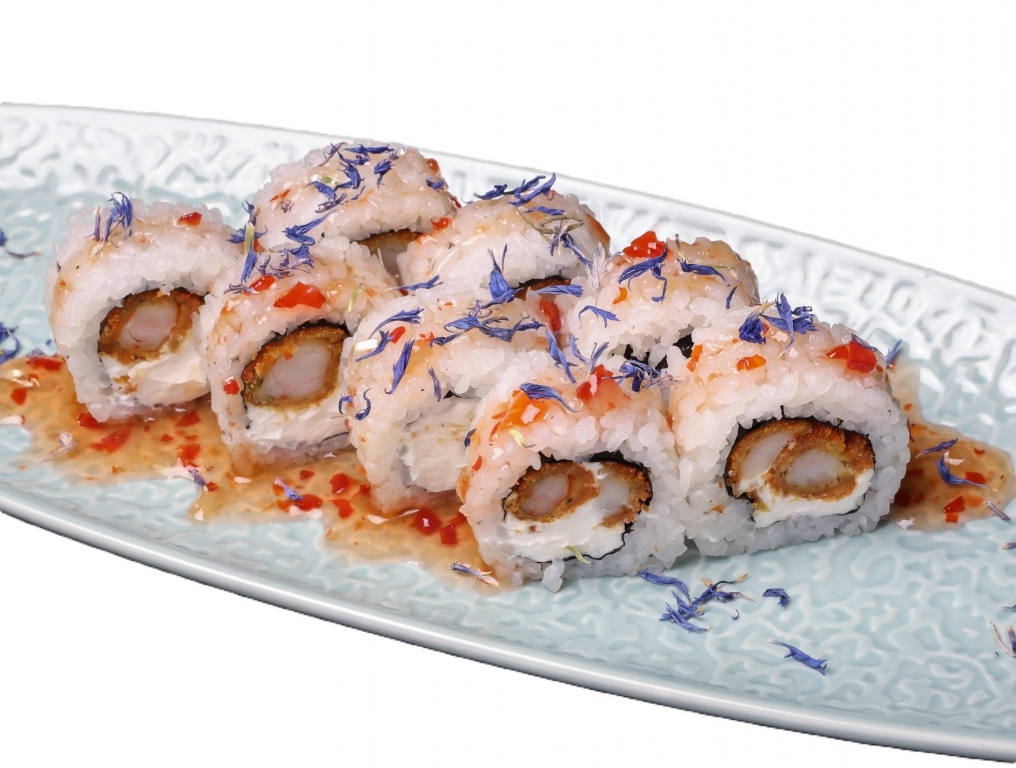 Ролл с креветкой темпура, сливочным сыром , лепестками василька и соусом сладкий чили