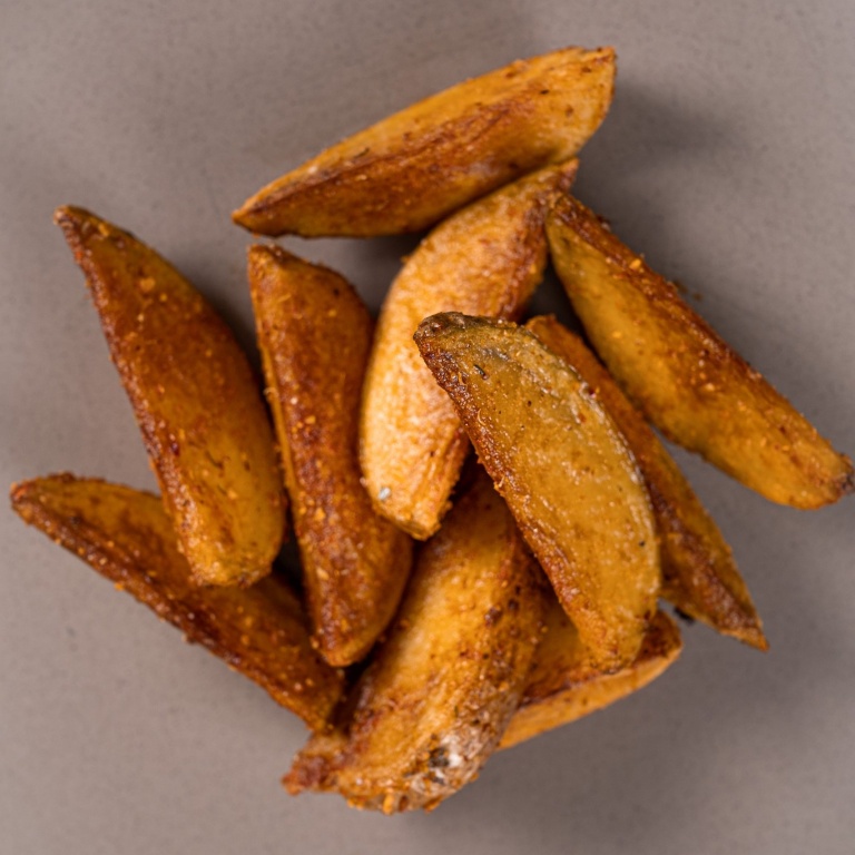 Картофельные дольки в специях, обжаренные во фритюре. Соус на выбор: барбекю, сырно-чесночный, тартар, цезарь, кетчуп, арахисовый чили