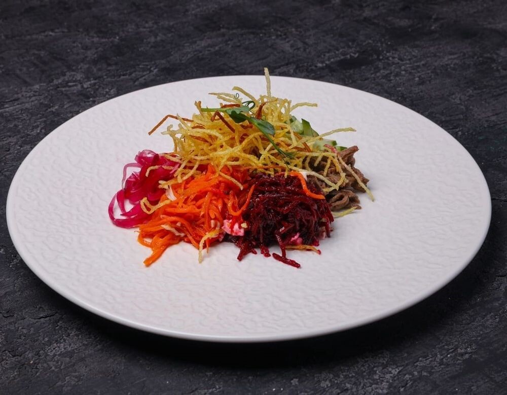 Говядина жареная, морковь и свекла по-корейски, огурец, капуста маринованная, картофель пай, лук маринованный, соус майонезный