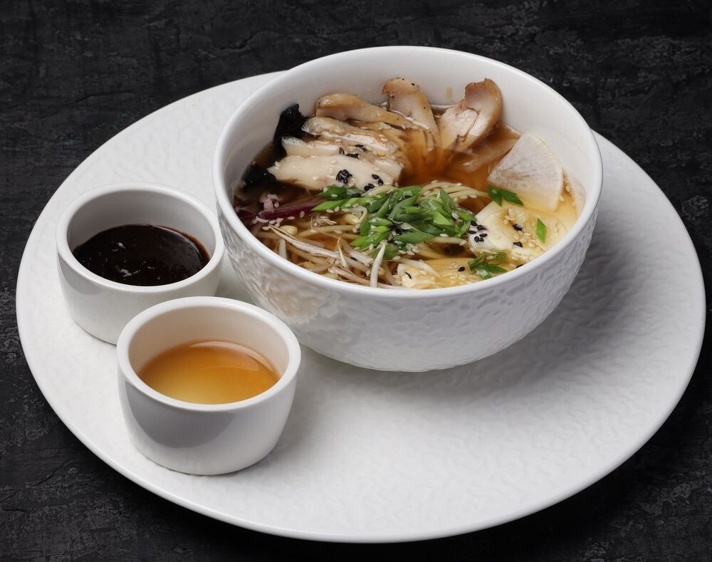 Авторский бульон из говядины, цыпленок, яичная лапша, дайкон, ростки маш, лук красный, зелень, кунжут. Подается с яйцом, острым и кислым соусом