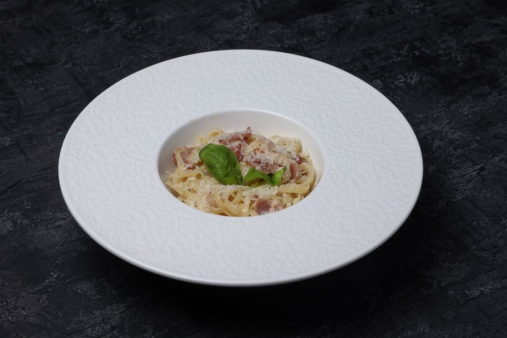 Спагетти, сливки, бекон, сыр пармезан, базилик