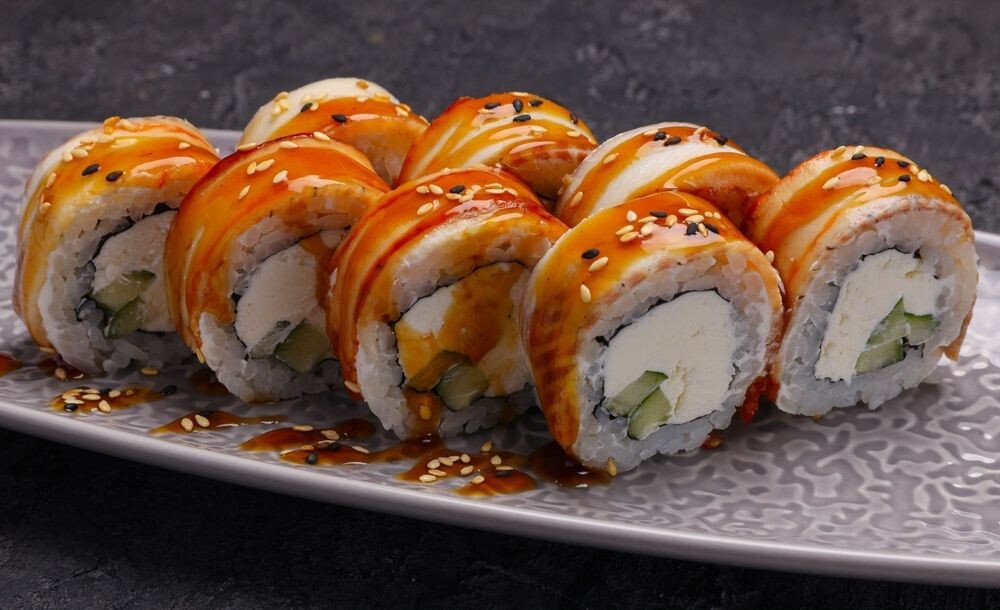 Ролл с угрем, сливочным сыром, огурцом, кунжутом и соусом унаги