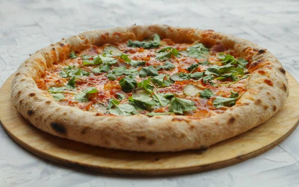 Бекон сырокопченый, огурец маринованный, сыр моцарелла, чипсы картофельные, кинза, соус барбекю (35 см)