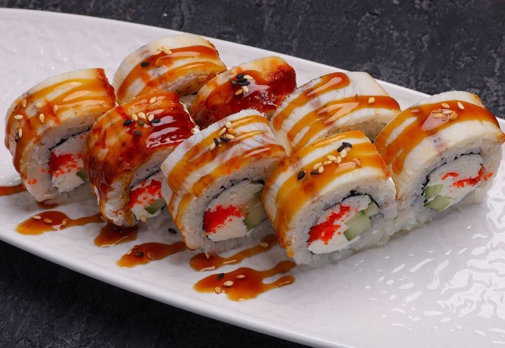 Ролл с угрем, снежным крабом сурими, сливочным сыром, огурцом, икрой масаго, кунжутом и соусом унаги