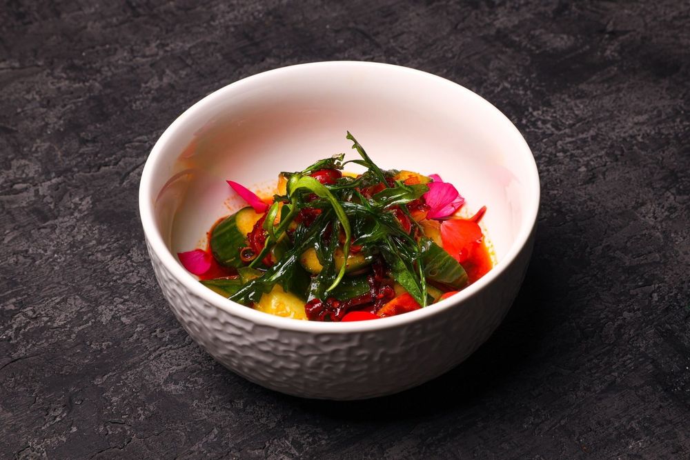 Огурец, соевый соус, перец чили, кунжут.