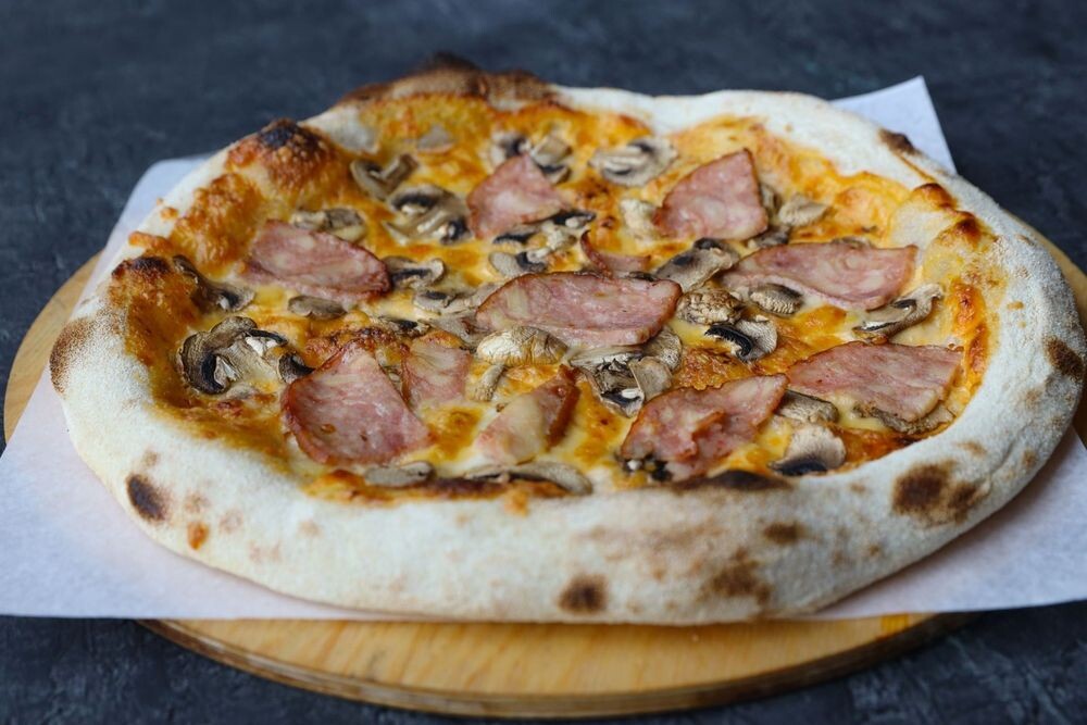 Ветчина куриная, шампиньоны, сыр моцарелла, сырно-чесночный соус (25 см)