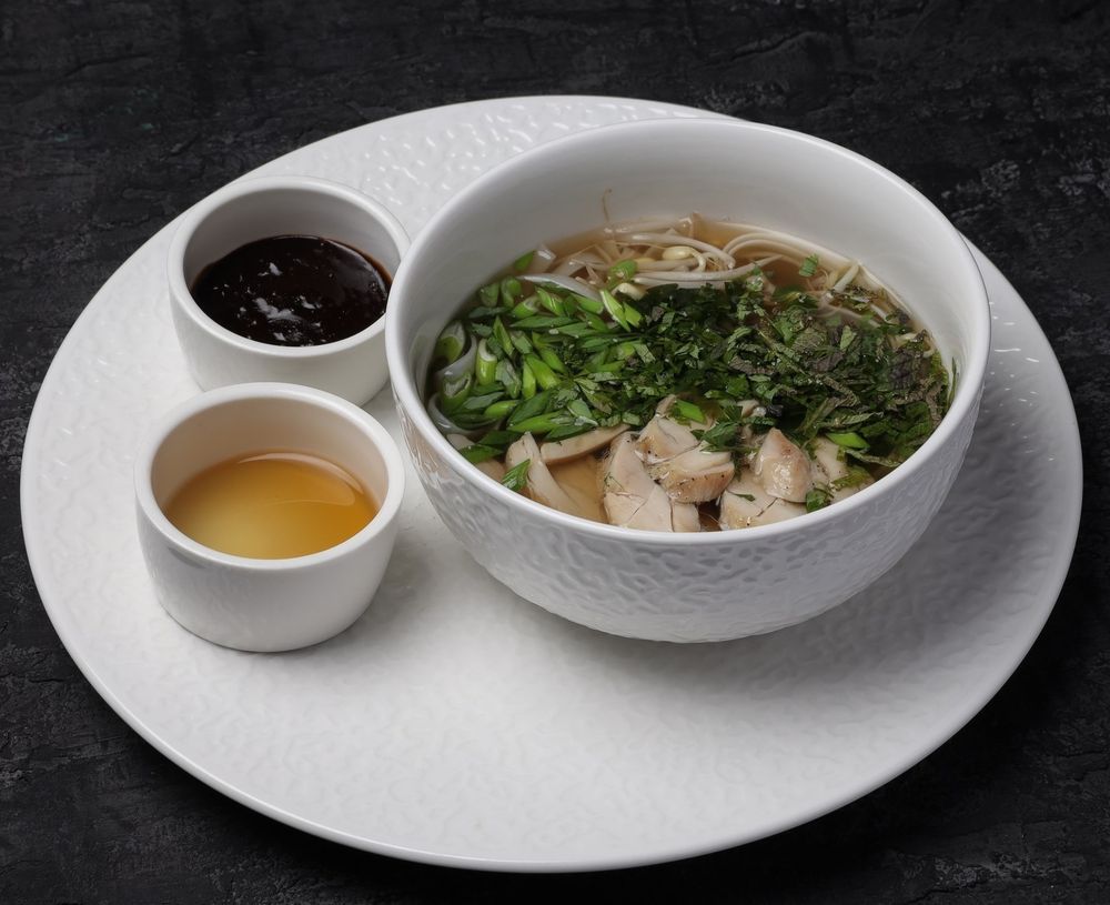 Бульон из говядины, рисовая лапша, цыпленок, ростки маш, кинза, лук зеленый, базилик, мята. Подается с острым и кислым соусом