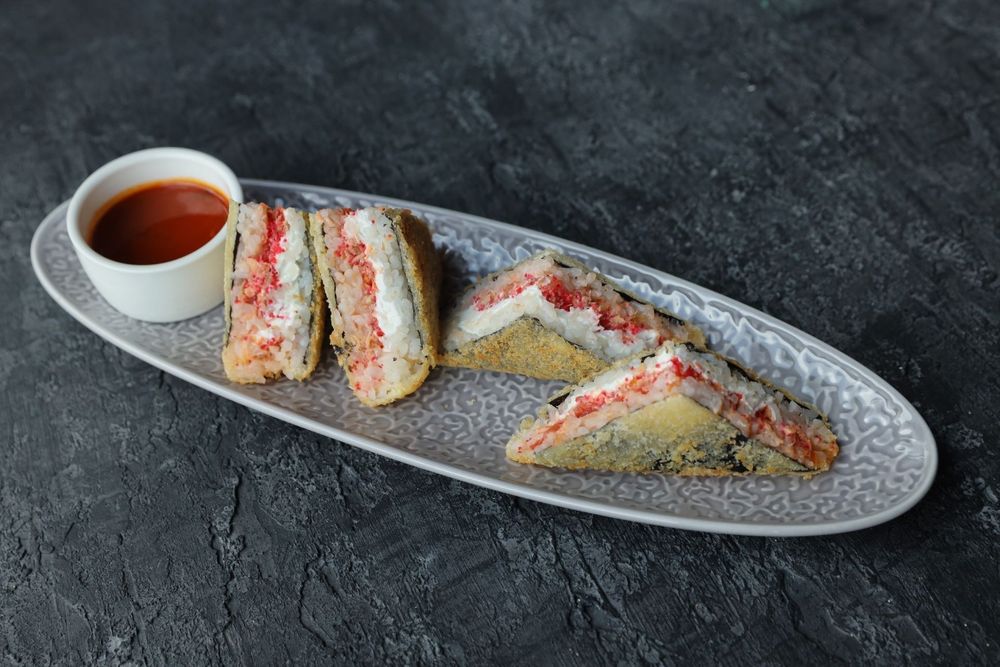 Сэндвич-ролл с лососем терияки, сливочным сыром, помидором, икрой масаго и соусом арахисовый чили