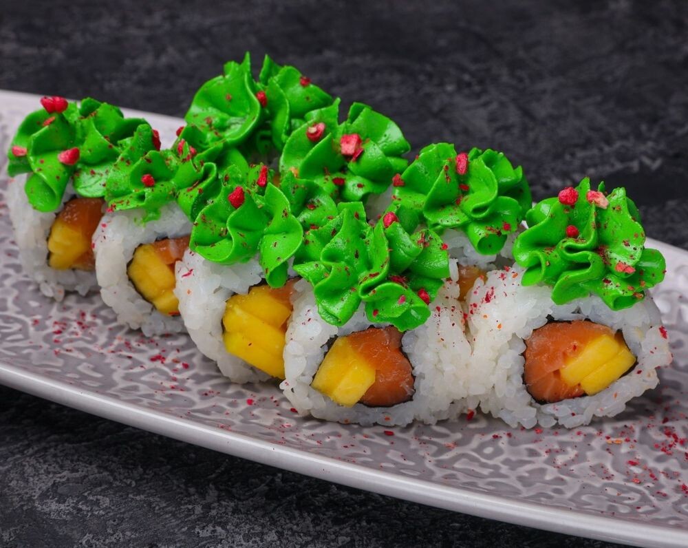 Ролл с лососем, манго, сливочным фисташковым сыром, клубникой