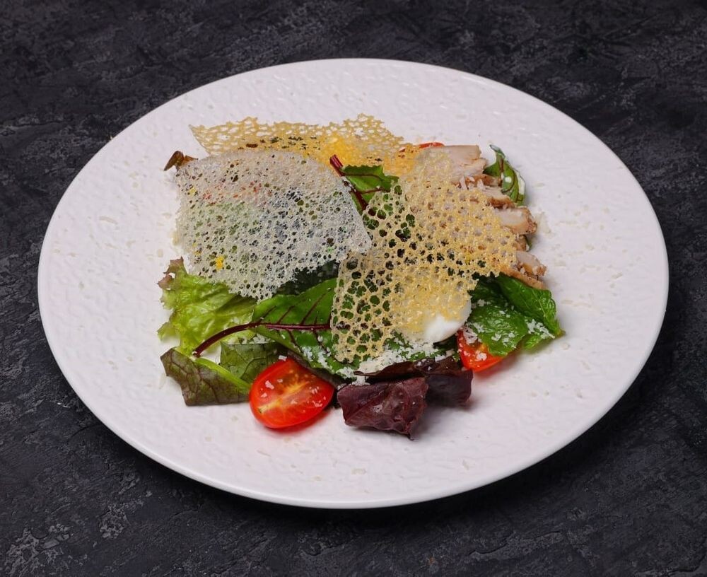 Курица печеная, томаты черри, сыр пармезан, микс салатных листьев, сухарики, соус цезарь