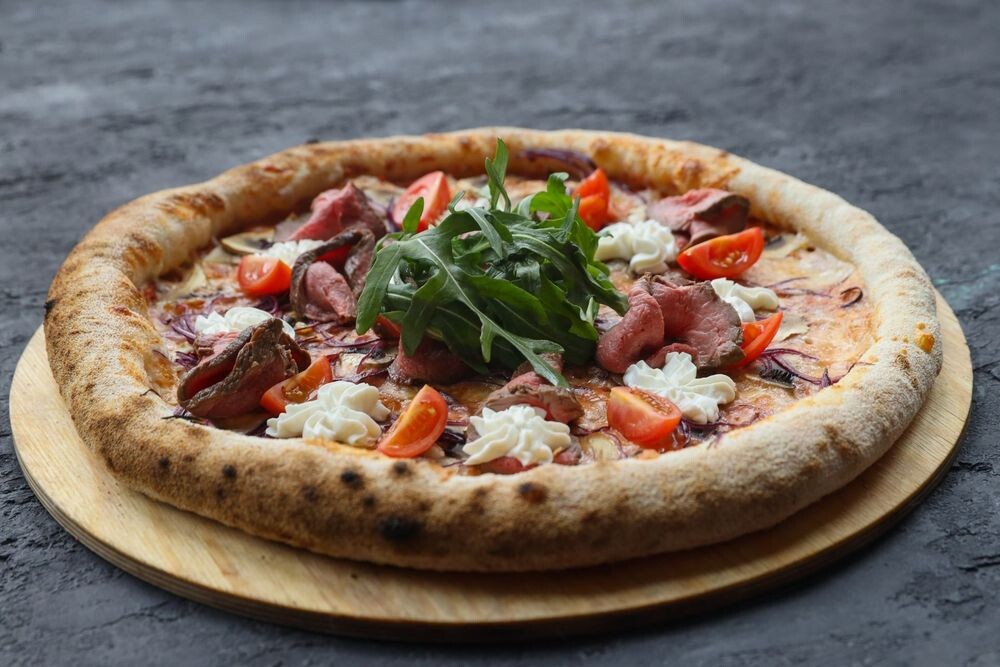 Ростбиф говяжий, шампиньоны, помидоры, лук красный, рукола, сливочный сыр, сыр моцарелла, дижонская горчица, томатный соус (25 см)