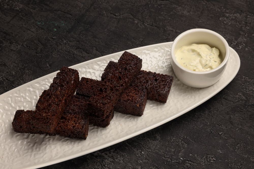 Жареный бородинский хлеб с добавлением чеснока, соус тартар