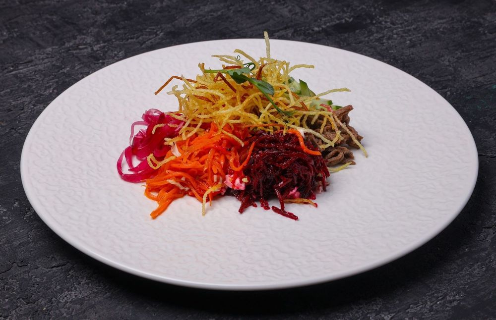 Говядина жареная, морковь и свекла по-корейски, огурец, капуста маринованная, картофель пай, лук маринованный, соус майонезный