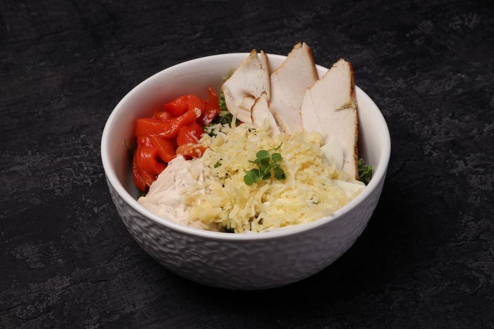Куриное филе, микс салатов, перец болгарский, яйцо, сыр Гауда, соус Цезарь.