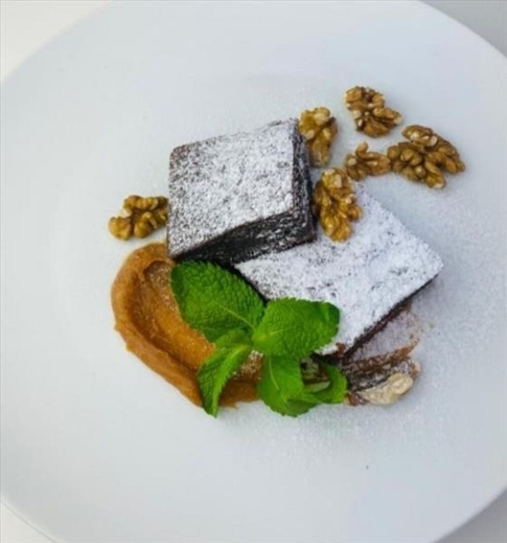 Пирожное собственного приготовления с ярким и насыщенным шоколадным вкусом: шоколадный бисквит, соленая карамель, грецкий орех, мята