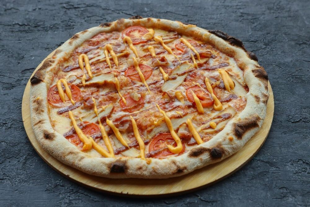 Цыпленок, бекон сырокопченый, сыр моцарелла, томаты, соусы томатный, медово-горчичный и сырный (35 см)