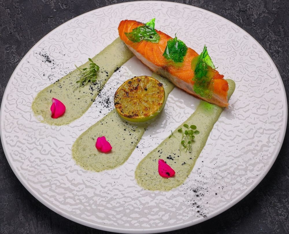 Стейк-филе из семги с огуречным соусом и печеным лаймом