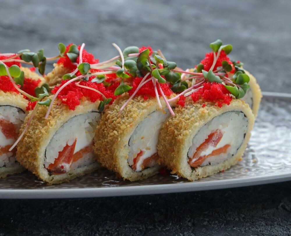 Темпурный ролл с лососем, сливочным сыром, помидором, икрой масаго и микрозеленью