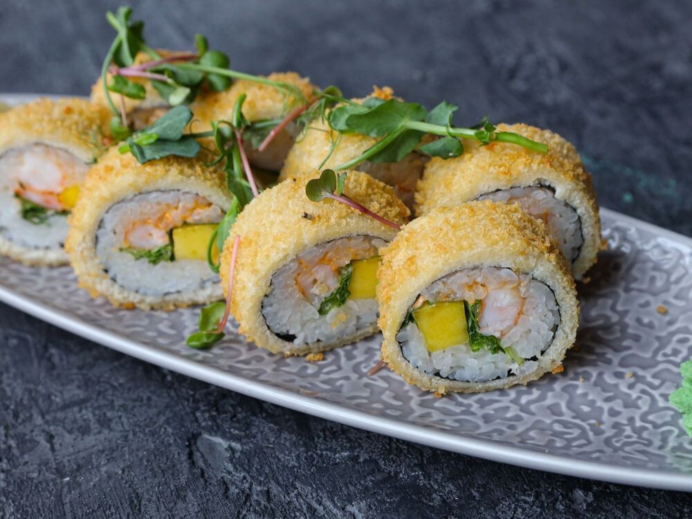 Темпурный ролл с креветкой, манго, листом салата, базиликом и соусом спайси